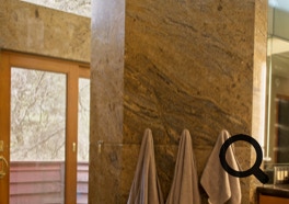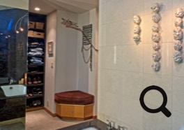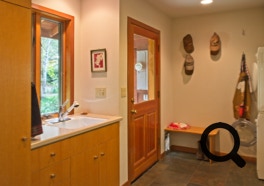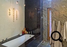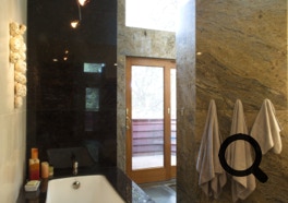 Nestled into a slope, the home opens onto intimate valley views and distant sierra vistas. The master bath space brings the outdoors into the space with a French door leading to a deck.