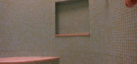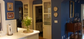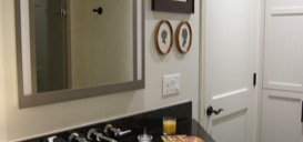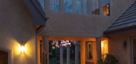 Earth tones, columns and a steel trellis mark the courtyard entry
